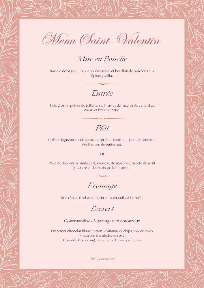 Ce menu sera également disponible le soir du 13 février et le midi du 14 février. Veuillez noter que pour la soirée du 14 février, seul ce menu spécial sera proposé. En revanche, le 13 au soir et le 14 à midi, vous aurez le choix entre ce menu et notre carte habituelle.